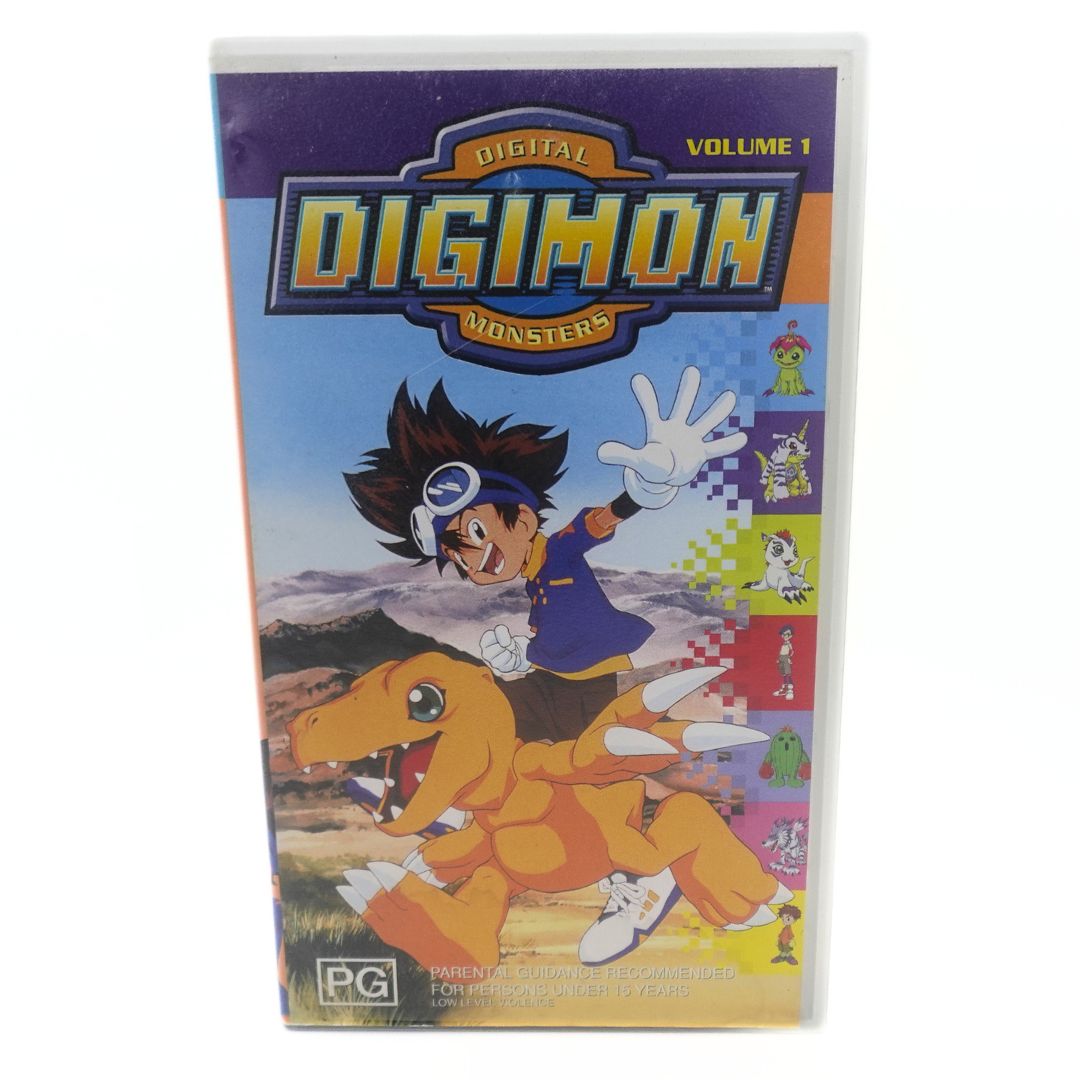 Relive your childhood with this 1999 Digimon Volume 1 VHS, the beginning of this awesome story. While the clamshell case is a little faded due to the sun and the tapes label sticker isn't quite so sticky anymore, this VHS is still a great find.